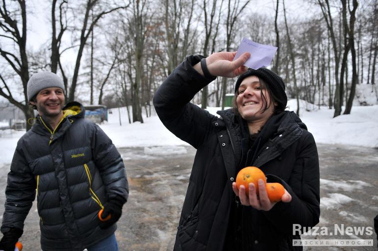 Всех, кто пришёл зарядиться цитрусовым весельем, да и просто прохожих Дед Мороз угощал мандаринами с предсказаниями.