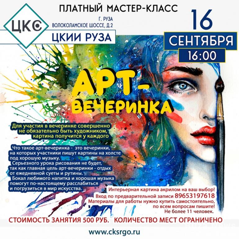 В Рузском центре культуры и искусств 16 сентября пройдёт «Арт-вечеринка». Жителей пригласили погрузиться в мир искусства и порисовать на холсте под хорошую музыку. Вход доступен по предварительной записи.